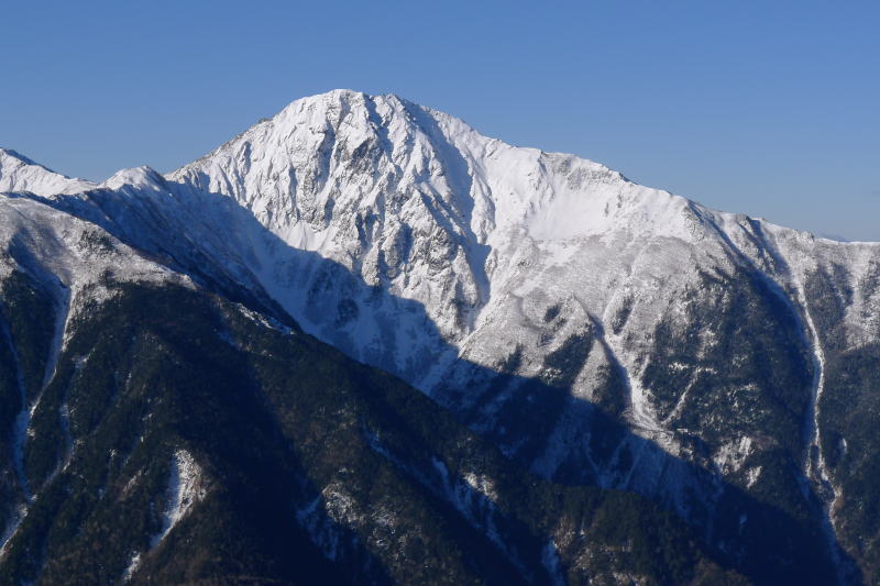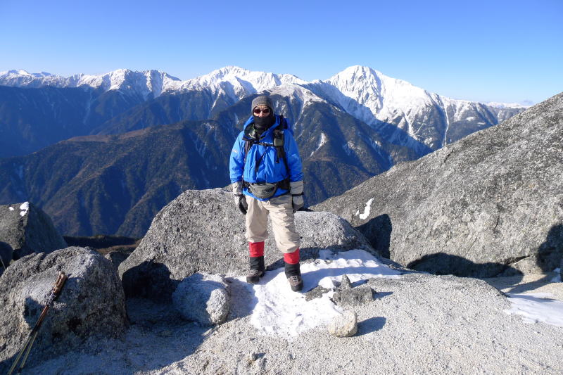 南御室小屋を出発し薬師岳に向かいます。小屋からはすぐ急登となります。途中2人の青年に追い越されます。目覚めていない体を動かす心臓の鼓動、吸い込むたびに凍りつく鼻孔、フェイスマスクからの蒸気で曇るメガネ・・・・・。それでも何となく歩き、薬師小屋で青年を捉えます。薬師岳の頂上標識でセルフタイマーをセットした青年のデジカメが強風で飛ばされます。北岳は雄々しく聳えています。素晴らしい〜。ここはカムエクかニペソツか。