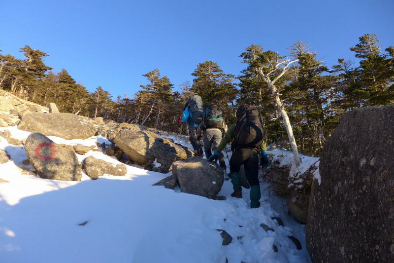 さて、今回の服装・装備はというと、ブリーフをウールにし、ロングのTシャツは夏用より少し厚手のウール、手袋は登り始めは夏用、稜線に出た時はミトンの厚手、テント設営時はゴム引き作業手袋、早朝の極寒稜線用にはゴアテックス+皮革+ダウンの防寒手袋、非常用にはゴアテックスの防寒手袋を用意したほか、いつも夏山で着ている服装です。テントもエアーマットも3シーズン用ですが、エアーマットの断熱能力がない分をフリースの生地敷き足すことで補うこととしました。歩いているときは多少の我慢はできるのですが、早朝の頂上及びテント内用にユニクロのウォームアップパンツ、ダウンのテントシューズと厚手のダウンインナーは欠かすことができません。