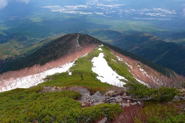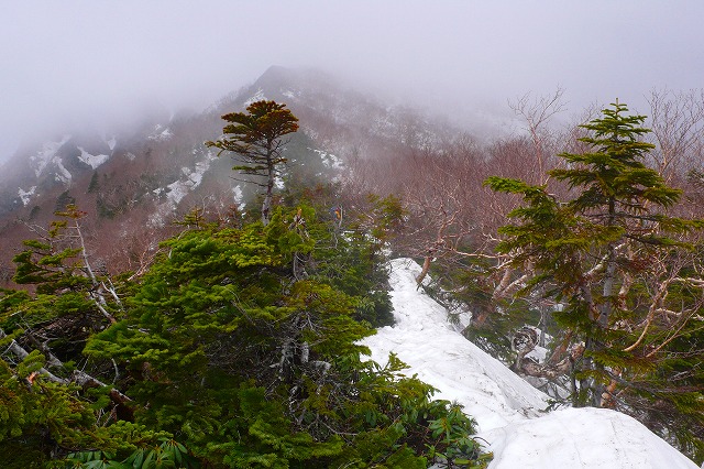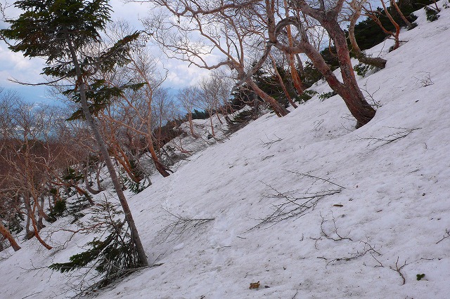残雪の尾根も背の高いハイマツに阻まれて,間もなく本来の登山道方向へと下りなくてはならない。しかし,結構急な斜面が続いていて,滑落した場合は斜面が疎林であることからも,アイゼンを装着し,ピッケルを手にする。先を行っていた夫婦はアイゼンやスットックを準備していなかったことから,再び尾根に出るまでの間,先頭に立って道を作りながら進む。