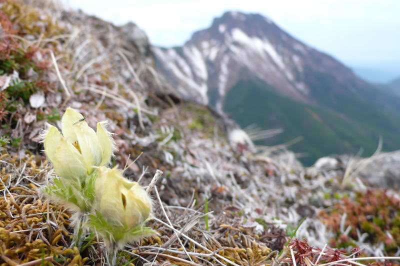 イチヨウランをもっと見たい、ベニバナイチヤクソウの群落も再訪したいので6時にテント場を後にする。こんなに早い時間なのに、ご夫婦が「シャカシャカ」と元気に登ってくる。ミドリ池(みどり池、緑池)に道を分け、往路には見つけることができなかったイチヨウランの群生地でザックを下ろす。少し腰を落として苔むした樹林下をのぞくと、イチヨウランがニョキニョキを花茎を伸ばし、あちこちに咲いている。早朝の素晴らしい風景である。