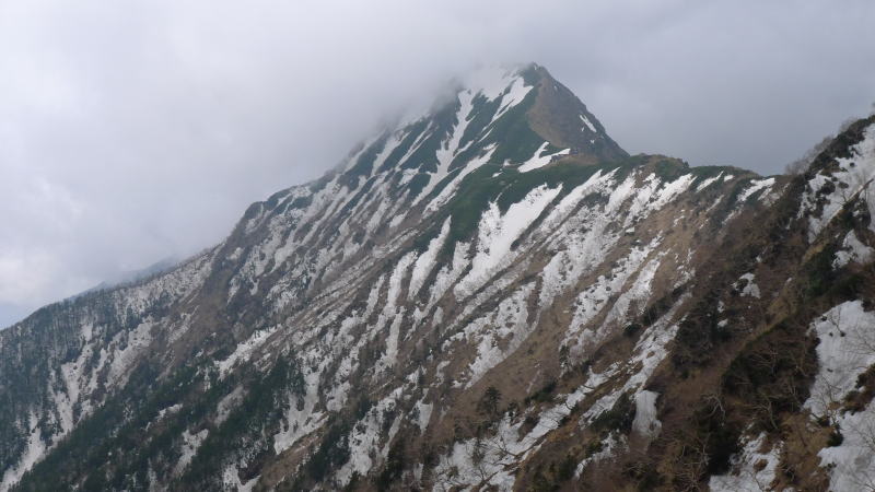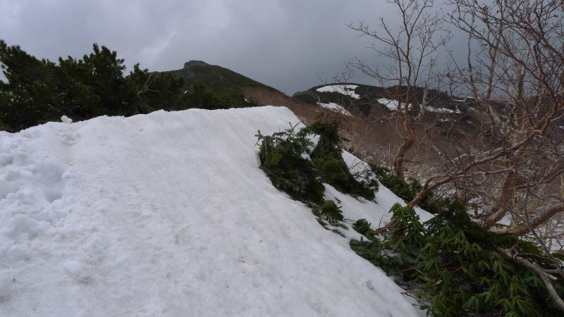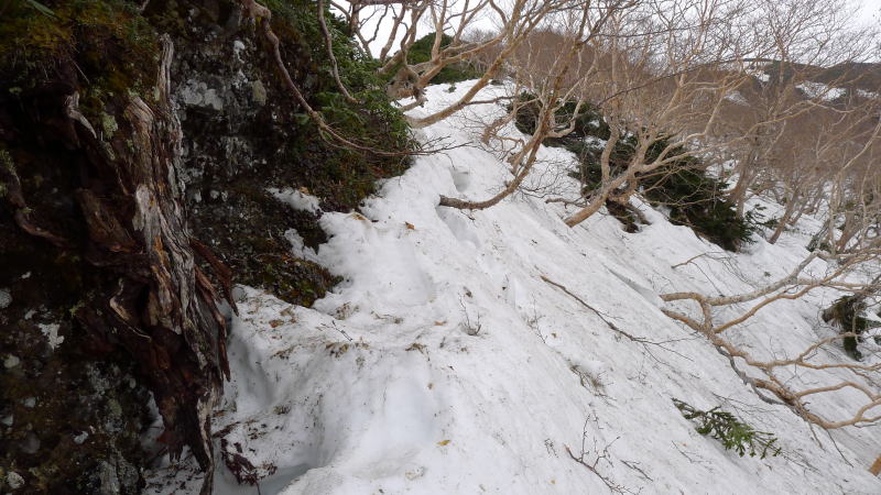 今回は夏道を辿らず、吹き溜まった雪を利用し尾根伝い登って行きます。滑ったら100m以上そのまま落ちてしまうような急斜面を横切ることもありますが、しっかりステップを切ってやり過ごします。(雪が柔らかくなるとズボッと腰以上まで踏み抜くので、もうすぐ夏道使う時期になるでしょう。)