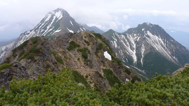 ハイマツの切れ目でアイゼンを付け、稜線を下って行くとこれから横岳を往復という男性、そのしばらく後で10人前後のツアーと思われる一団とすれ違います。外人さん2人も横岳往復と意気軒昂ですが、最後の男性は足下も悪く、もう時間も遅いということで一緒に下山することになりました。