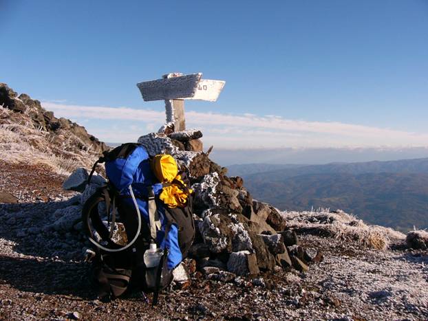 翌朝,まだ日も明けやらぬうちに小屋を出て真狩コースに戻り,お鉢を時計回りと反対に喜茂別コース方面へと向かう。昨晩の最低気温は氷点下5度で,登山道には霜柱があり,お鉢の周辺の木や岩には樹氷が着いている。