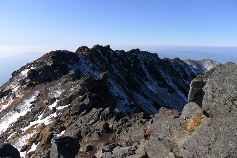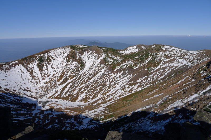 羊蹄山は活火山ということだ。火口の深さが200mもあるということで、お鉢周りをしながら対岸を見るとなぜか日高の山の斜面を見ているような山岳風景である。火山礫で盛り上がったお鉢は荒々しく、雪で足を取られないように一回りし下山ルートに入る。もう9時を大きく回っているので、今朝登ってきた人たちとのすれ違いが多くなる。