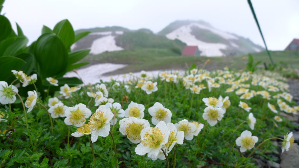 朝日小屋から白馬岳に行く場合は、この時期はトラバース道には雪渓が残っていて通行できないが、昨日ここを通ってきたという人に聞くと、アイゼンなしで何の問題もなかったということだった。朝日岳への登り返しの300m余にも辛いものがあるので、チングルマやハクサンコザクラに見送られてトラバース道に入る。