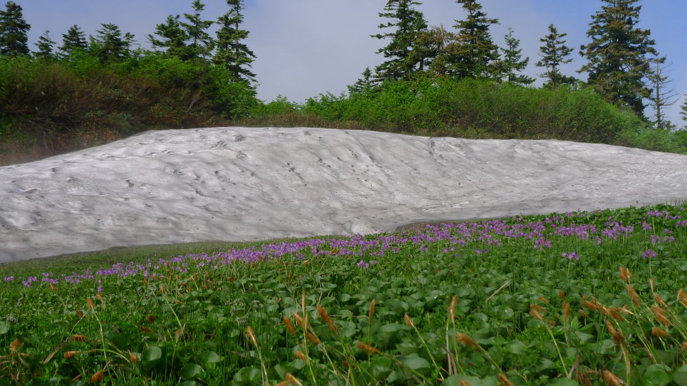 「トラバース道」と言う名前は、なにか楽をさせてくれそうな名前だが、アップダウンは多く道も荒れているほか、崩壊か所も見らる。また、雪渓はスプーンカットができているのでアイゼンは不要だったが、もう少し早い時期であればその通行は遠慮するのがいいのかもしれない。約1時間で朝日岳頂上から下りてくる登山道に出合ったが、この間、このトラバース道にはミズバショウとキヌガサソウがわずかに咲いていただけで、(この時期は)見るべきものがなかった。
