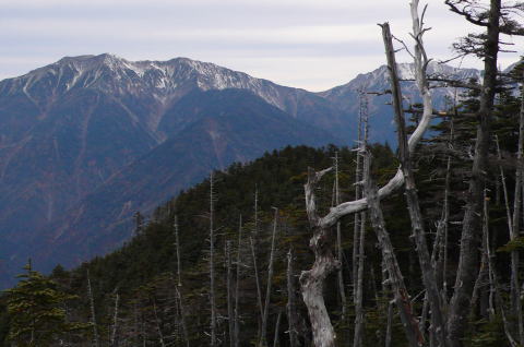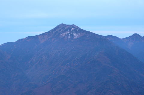 相変わらずうっそうとした樹林帯を進むとぽっと展望が開けると笊ヶ岳の頂上に出る。荒川岳、赤石岳、聖岳、後ろを振り向くと小笊に富士山・・・。聖岳の東尾根には樹氷が見られる。これらの山々にはまだ登る機会がないが、いつかはあの稜線をつないで歩いてみたい。小笊から続くランカン尾根は見通せないが、あれは深田久弥が登った大武刀尾根だろうか。ざっくりえぐられた生木割山手前の崩壊地、そのはるか先に見える槍の姿をした山・・・。大展望をしばし楽しむ。