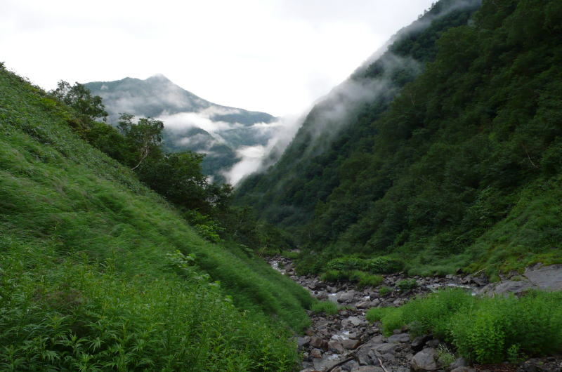 午前8時15分、八ノ沢出合のテン場に着く。オレンジ色のアライのテントが張られている。先の2人のものだろう。無事の下山を願う。午前10時、ようやく7ノ沢出合に到着する。すると、河原で甲羅干しをしている男性が見える。昨晩、テントに入らないかと声を掛けた男性だ。「暗くなってしまい、自分のテントを張った場所が見つからず、ビバークしました。」という。ビバークと言っても、降雨の中、木の下で寝れたかどうかだろう。携帯電話がほとんど通じない山中においてラジオでの気象情報入手、濃霧の中でのGPSでのルート確認、光量があって照射距離が長く電池の持ちのいいヘッドランプでの登路照射、小型ラジオでの気象情報入手は不可欠であることを再確認した。