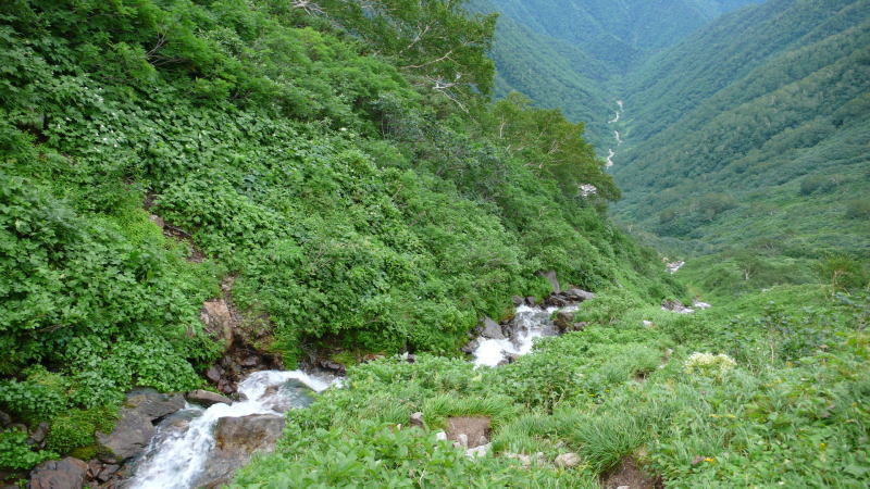 午後2時までに札内川ヒュッテに下りる必要がある。追われるように雨も降りてきた。テントを撤収し、朝の冷たい源頭の水を口に含んで沢に向かう。源頭からしばらく下りたところで、彼方に単独男性が登って来る。だんだん近づいてくると、鮮やかな色のシャツをまとった人であり、八ノ沢出合での救出騒ぎがあったばかりのカムイエクウチカウシ山を登る単独の人は、「学生さん」かなと思っていた、その人はホームページ「オジロワシの空の下」の「たかさん」であり、思わずうれしくてなつかしくて「千歳のたかさんですか。」と声を掛けてしまった。たかさんが差し出した手を、がっちりと握る。遭難事故が続いている厳しい時期の日高山脈、カムイエクウチカウシ山での男と男の挨拶であった。
